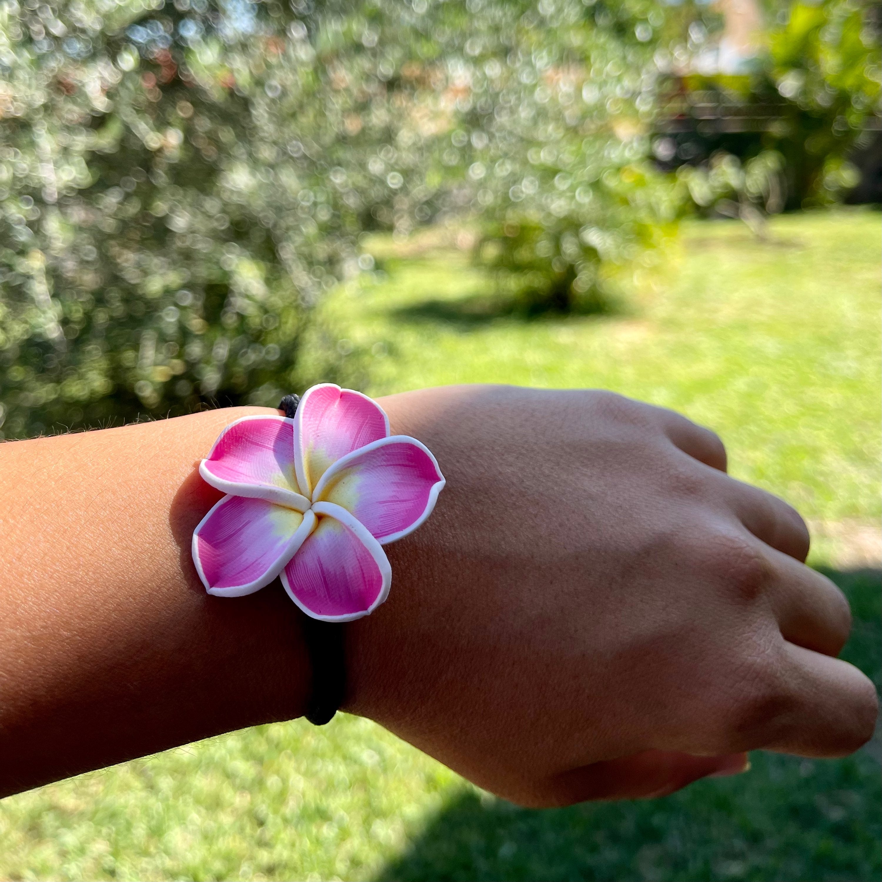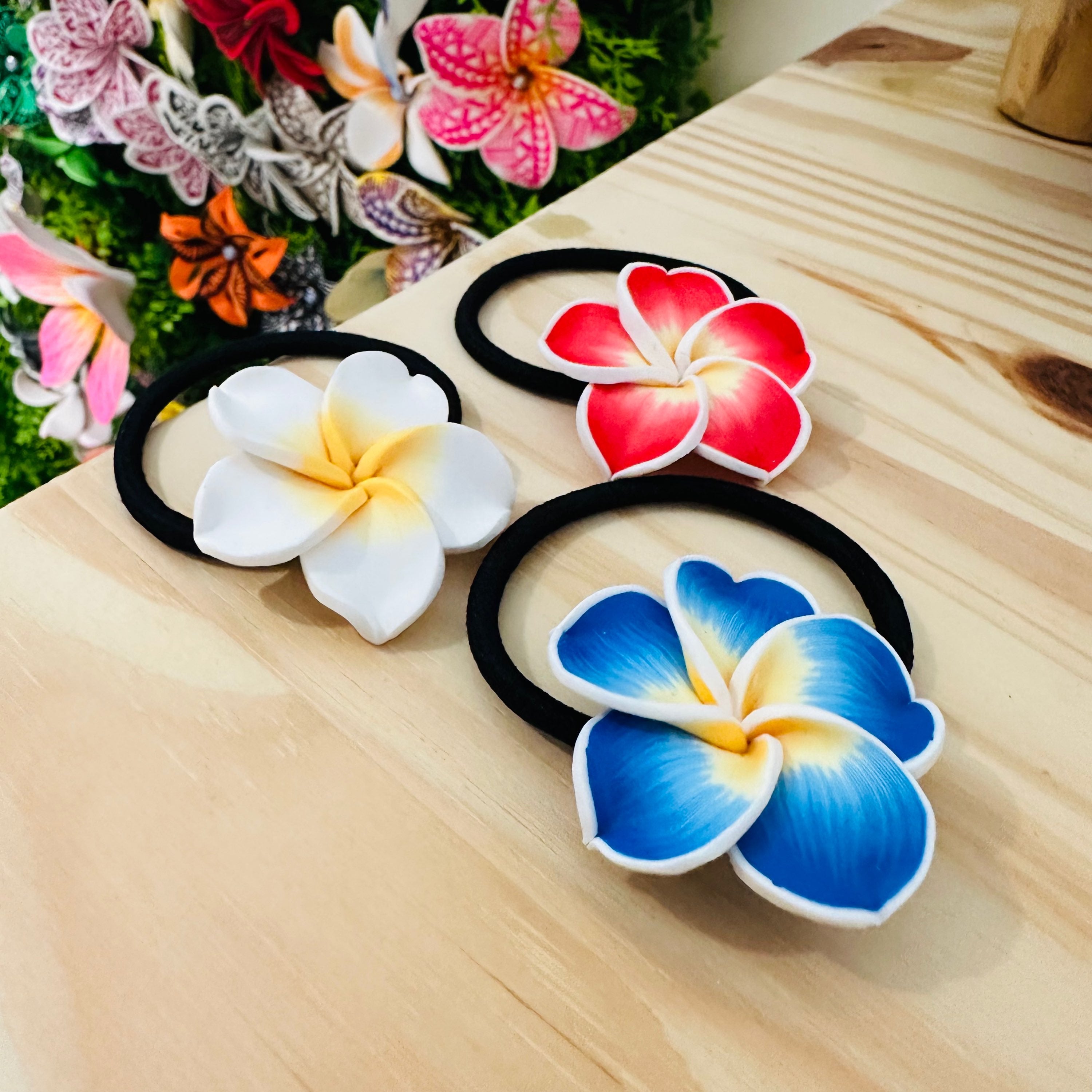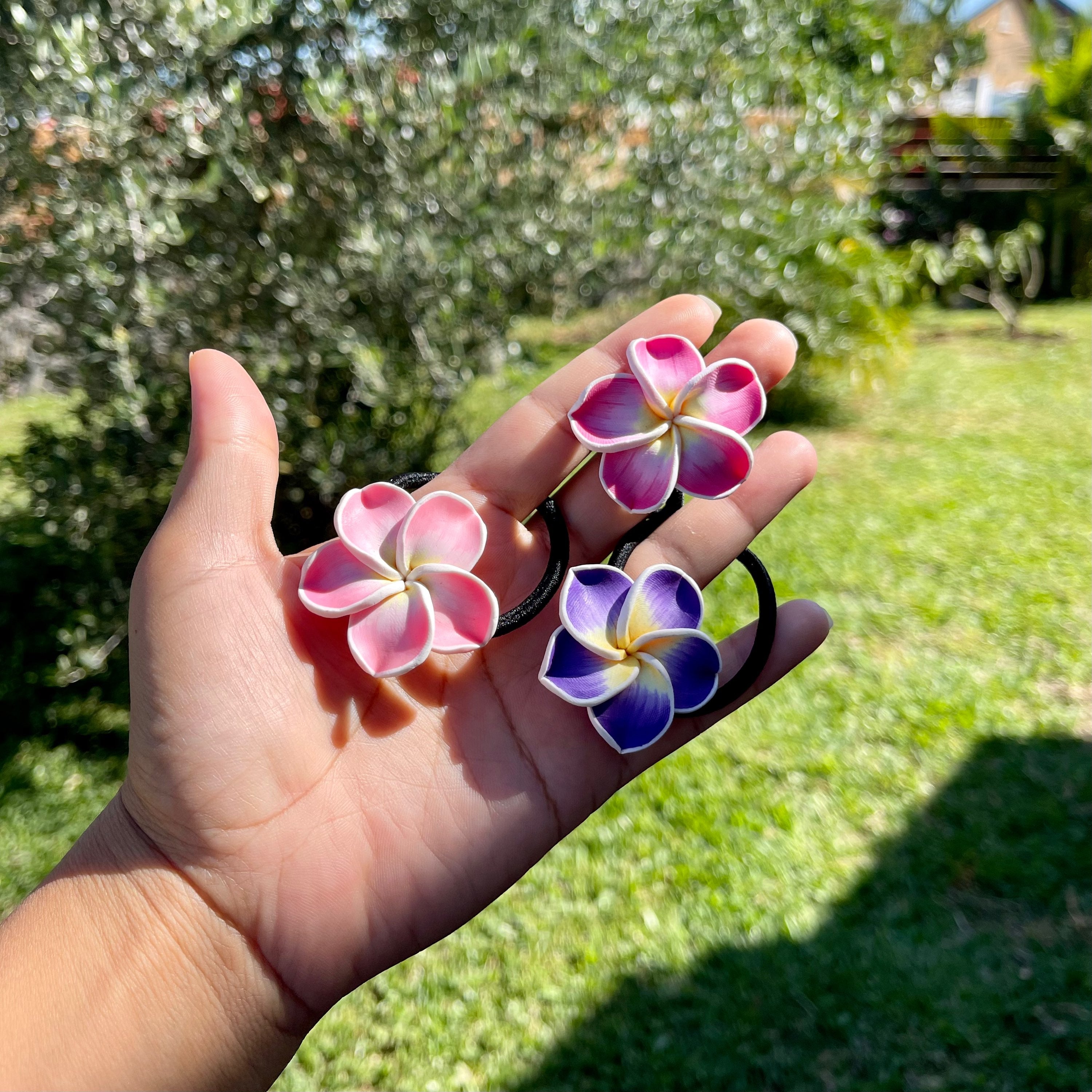 • Frangipanier en polymère (une matière solide) fixée à un élastique noir. Plusieurs coloris disponible